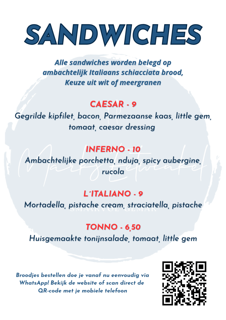 Benieuwd naar het aanbod? Bekijk het menu op onze website of volg onze social media kanalen voor speciale sandwiches en maaltijden.