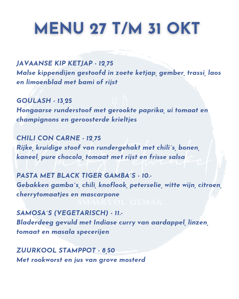 Elke week bieden wij een ruime keuze aan dagverse maaltijden aan, zorgvuldig bereid met de meest verse ingrediënten. Of je nu trek hebt in een heerlijke visgerecht, een smaakvol stuk vlees, of een voedzame vegetarische maaltijd, bij Mark’s Eetwinkel hebben we voor ieder wat wils. Kom langs en ontdek de toegankelijke en culinaire hoogstandjes die wij met passie en vakmanschap voor jou bereiden.