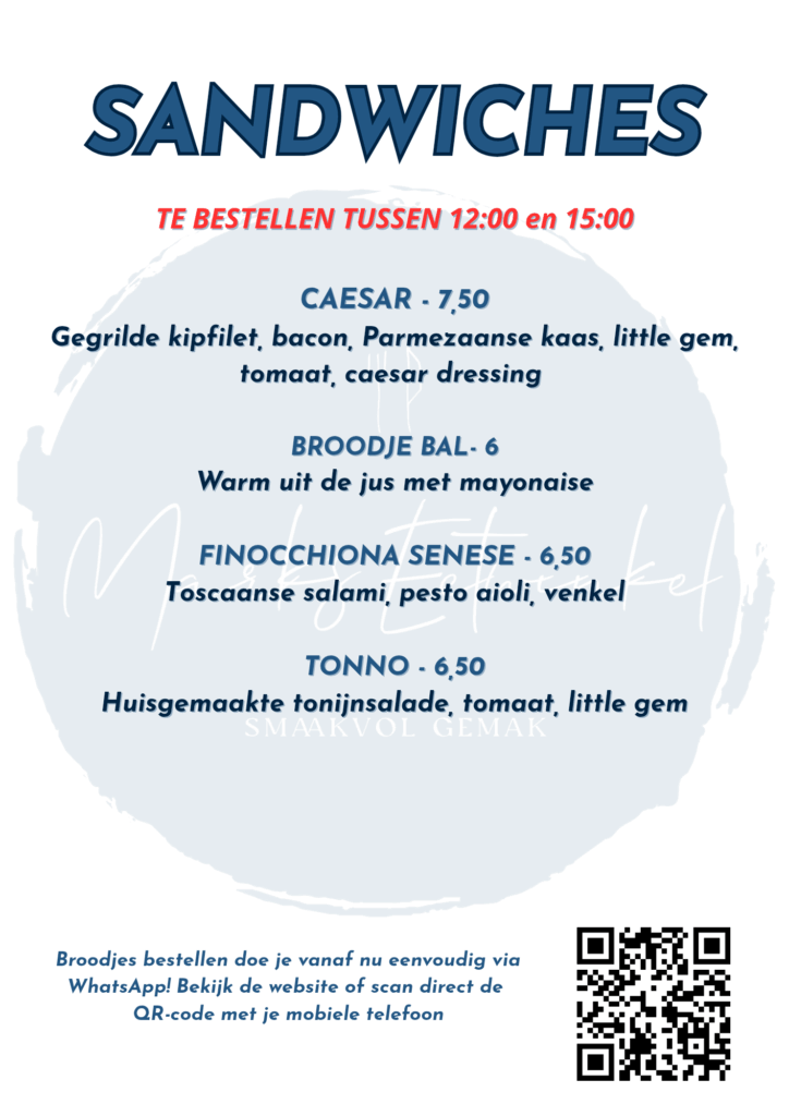 Benieuwd naar het aanbod? Bekijk het menu op onze website of volg onze social media kanalen voor speciale sandwiches en maaltijden.