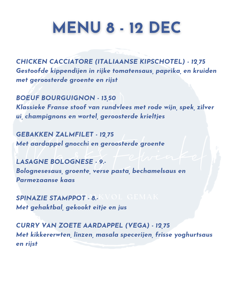 Deze kerst hebben wij een prachtig 3-gangen kerstmenu gemaakt. Daarnaast is het natuurlijk ook mogelijk om losse gerechten te bestellen.