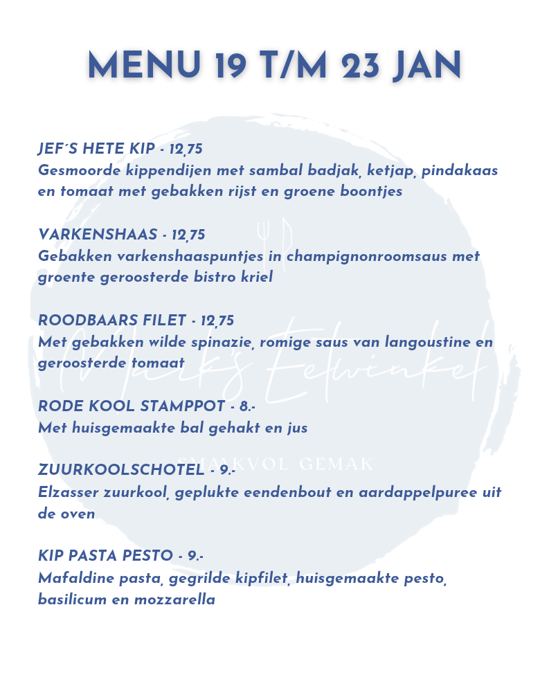 Elke week bieden wij een ruime keuze aan dagverse maaltijden aan, zorgvuldig bereid met de meest verse ingrediënten. Of je nu trek hebt in een heerlijke visgerecht, een smaakvol stuk vlees, of een voedzame vegetarische maaltijd, bij Mark’s Eetwinkel hebben we voor ieder wat wils. Kom langs en ontdek de toegankelijke en culinaire hoogstandjes die wij met passie en vakmanschap voor jou bereiden.